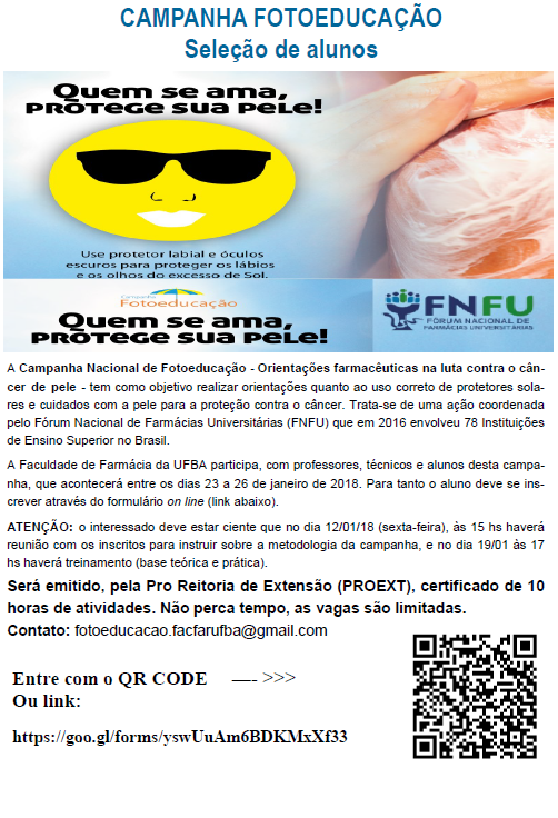 A Campanha Nacional de Fotoeducação - Orientações farmacêuticas na luta contra o câncer de pele - tem como objetivo realizar orientações quanto ao uso correto de protetores solares e cuidados com a pele para a proteção contra o câncer. Trata-se de uma ação coordenada pelo Fórum Nacional de Farmácias Universitárias (FNFU) que em 2016 envolveu 78 Instituições de Ensino Superior no Brasil.