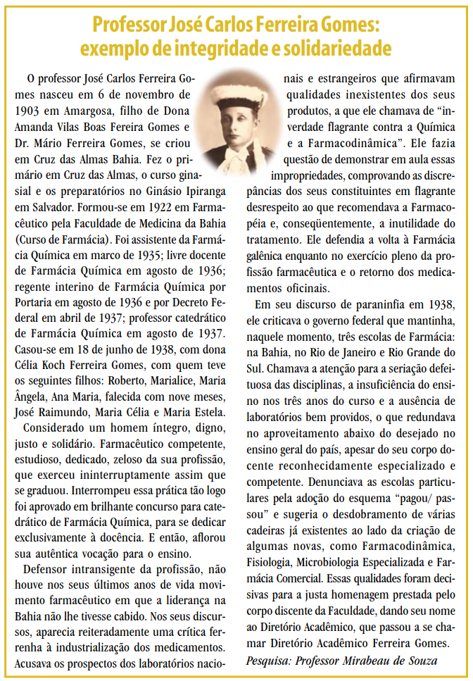 Mirabeau de Souza. (2008). Professor José Carlos Ferreira Gomes: exemplo de integridade e solidariedade. CRF-BA em Revista, Ano II - Nº 4, Fevereiro/2008. Recuperado do link https://www.crf-ba.org.br/wp-content/uploads/2021/08/revista_04_2008.pdf em 04/03/2024.