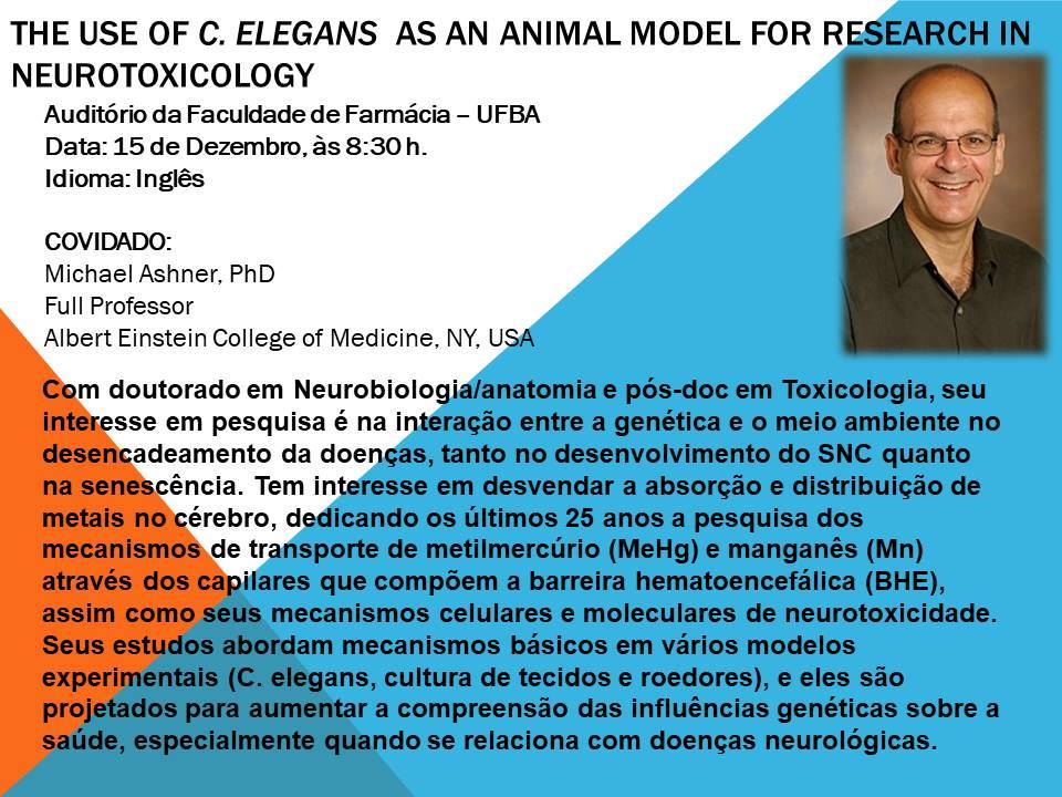 O neurobiólogo Michael Aschner, Ph.D., professor e pesquisador americano do Albert Einstein College of Medicine (New York) conhecido por sua pesquisa sobre o efeito de metais pesados no cérebro realiza palestra sobre o uso de um nematódeo como modelo animal em pesquisas de neurotoxicologia na Faculdade de Farmácia da UFBA.